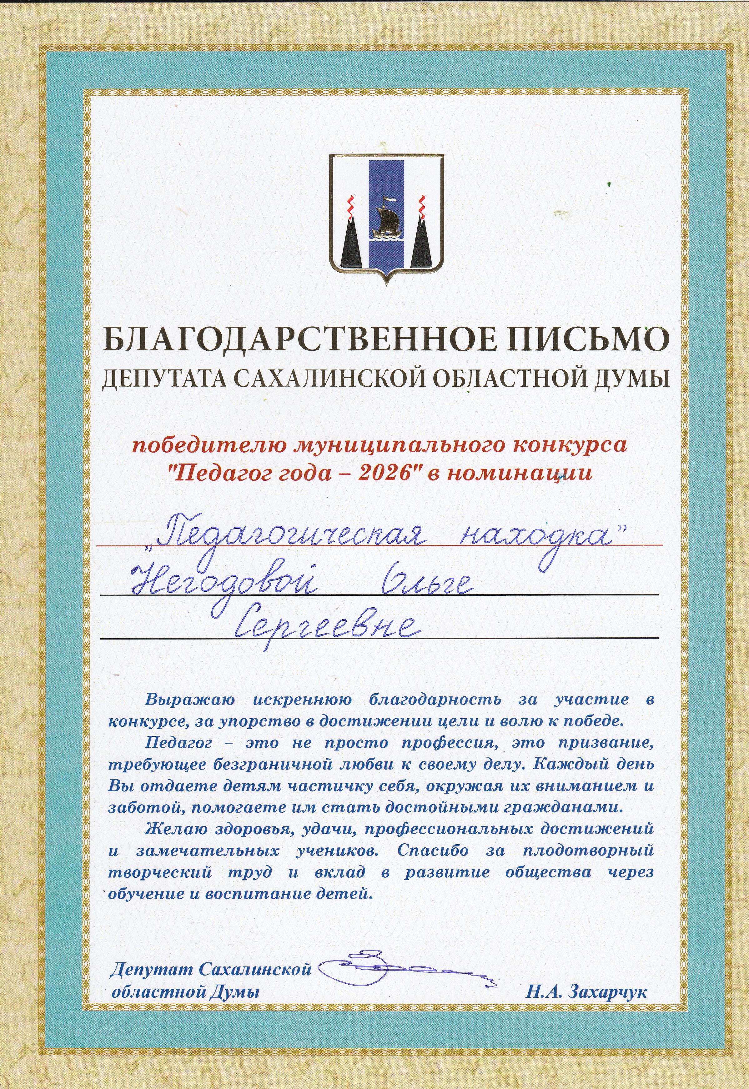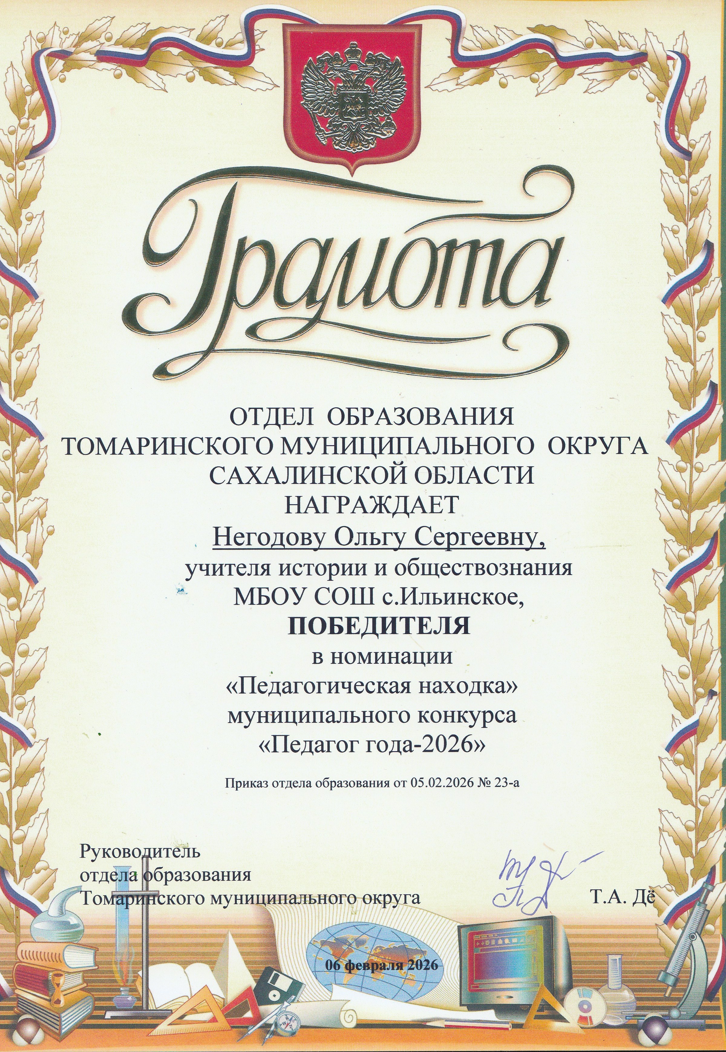 Грамота Победителя в номинации "Педагогическая находка" муниципального конкурса "Педагог года-2026"