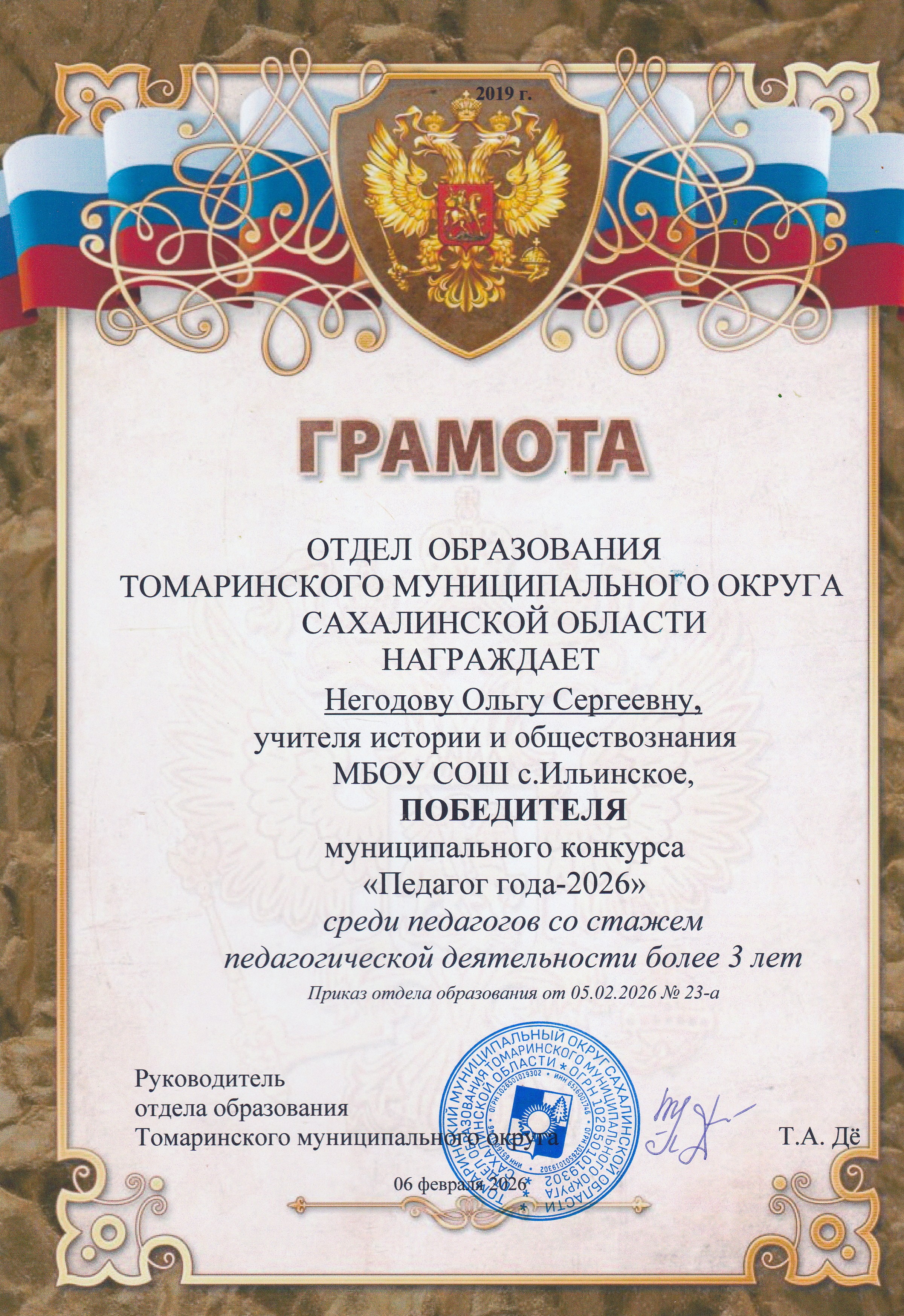 Грамота Победителя муниципального конкурса "Педагог года-2026"